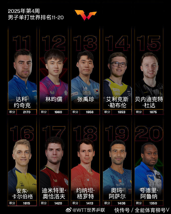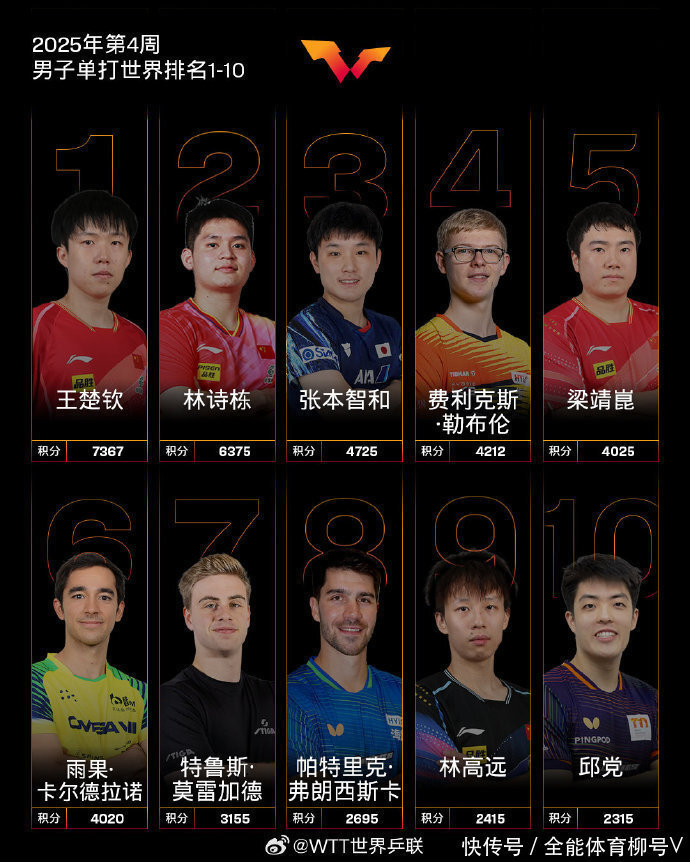马斯喀特站结束后,国际乒联2025年第4周世界排名火热出炉。男子单打方面,中国队在前10占据4席,王楚钦、林诗栋高居世界第一和第二,梁靖崑排在第五,林高远排在第九。